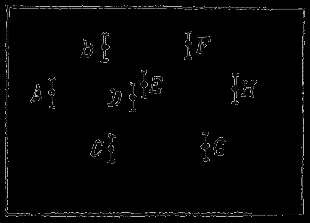 Рис. 7. Экспериментальные точки на диаграмме Фейнмана. Соедините их между собой всевозможными сплошными, пунктирными и волнистыми линиями. Раскрасьте их калибровочно инвариантным образом.