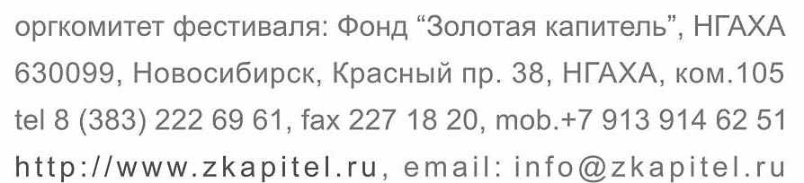 | БАНКОВСКИЕ РЕКВИЗИТЫ 630099. г. Новосибирск, ул. Ядринцевская, 70 Фонд «Золотая капитель» Получатель ИНН 5406294583 Р / С 40703810400000000142 Банк ОАО КБ «АКЦЕПТ» Кор / счет 30101810200000000815 БИК 045004815 КПП 540601001 Целевые благотворительные и регистрационные взносы для КОНКУРСА “ЗОЛОТАЯ КАПИТЕЛЬ” | ![]() |