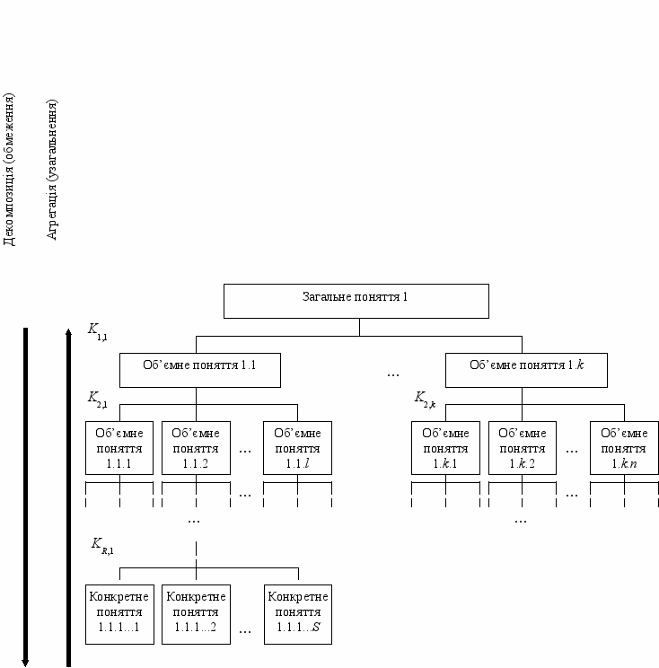 Для побудови системи понять “по вертикалі” використаємо принципи системного підходу. Для побудови системи понять у напрямку “зверху-вниз” використаємо принцип поетапної декомпозиції (обмеження), а для побудови системи понять у напрямку “знизу-вверх” – принцип узагальнення, або агрегації даних.