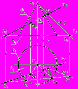 - Через прямую n и вершину S конуса проводим плоскость общего положения : ( n m); m S.