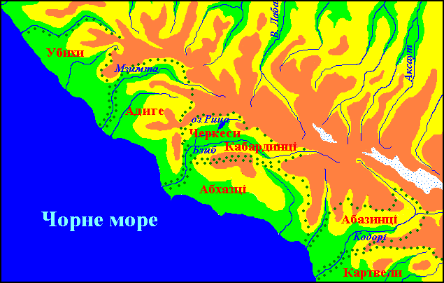 Мал. 11.Ареали формування абхазо-адизьих мов в західій частині Кавказу.