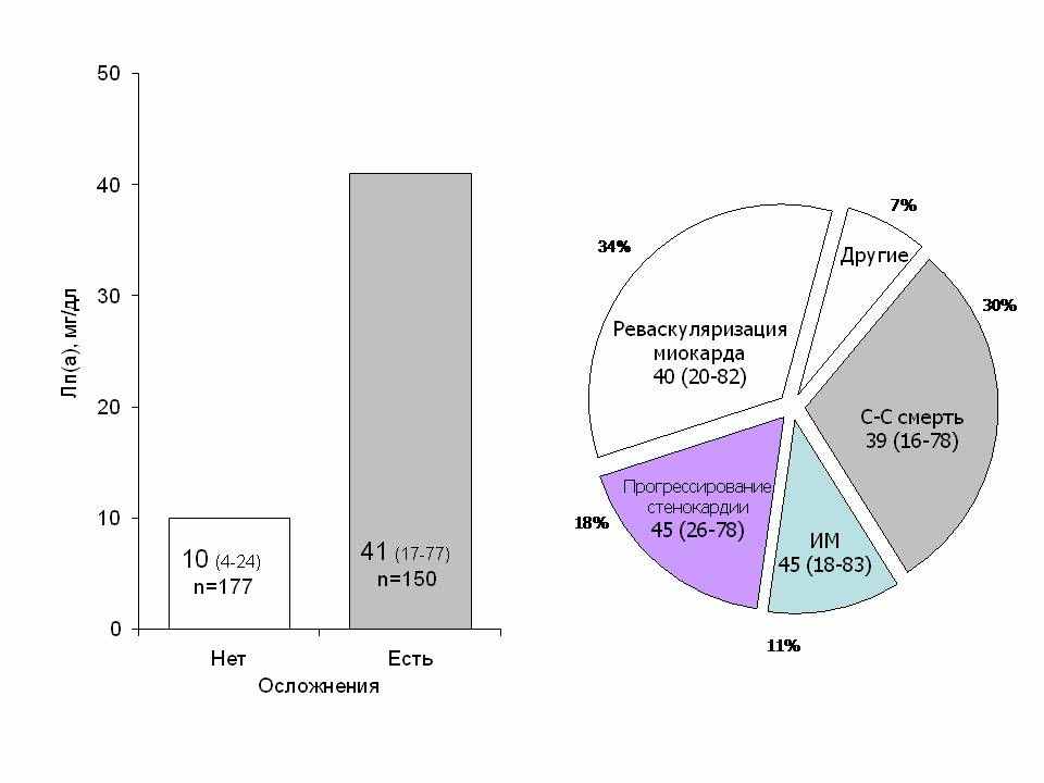 6. При многолетнем проспективном наблюдении отмечено существенное увеличение риска развития сердечно-сосудистых осложнений (сердечной смерти, инфаркта миокарда, прогрессирования стенокардии и реваскуляризации миокарда) при высоком уровне Лп(а) в группах консервативного, эндоваскулярного и хирургического лечения хронической ишемической болезни сердца.