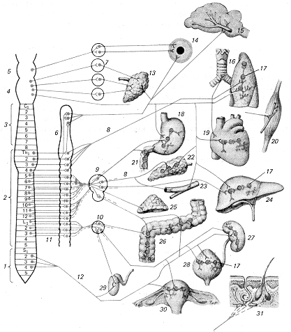 Рис. 1.1. Вегетативна нервова система (загальний план будови еферентної частини): 1 — крижовий відділ спинного мозку (S), 2 — торако-люмбальний відділ спинного мозку (Тh-L), 3 — шийний відділ спинного мозку (З), 4 — довгастий мозок, 5 — середній мозок, 6 — прикордонний симпатичний стовбур (паравертебральні ганглії), 7 — парасимпатичні вузли голови, 8 — постгангліонарні волокна, 9 — сонячне сплетіння і його вузли, 10 — каудальне брижове сплетення і його вузли, 11 — прегангліонарні волокна, 12 — тазовий нерв, 13 — слинні залози, 14 — внутрішні м'язи очей, 15 — судини головного мозку і його оболонок, 16 — трахея, бронхи, легеня, 17 — функціональні модулі метасимпатичної нервової системи, 18 — шлунок, 19 — серце, 20 — скелетний м'яз, 11 — дванадцятипала кишка, 22 — підшлункова залоза, 23 — судини внутрішніх органів, 24 — печінка, 25 — надниркова залоза, 26 — товста кишка, 27 — нирка, 28 — сечовий міхур, 29 — внутрішня частина чоловічих статевих органів. 30 — матка, 31 — шкіра