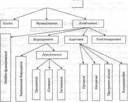 На думку Б. М. Андрушкова та О. Є. Кузьміна, існують два основні типи структур управління: ієрархічні та органічні (рис. 4.1). Вони наводять також таку класифікацію організаційних структур (рис. 4.2), де дві основні структури управління - лінійна та функціональна, а всі інші — це розмаїття існуючих структур, які є результатом комбінації цих двох основних типів.