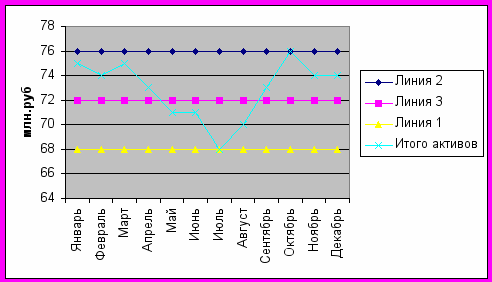 3. Линия 1 (при 68) характеризует агрессивную стратегию, при которой долгосрочные пассивы покрывают внеоборотные активы и системную часть текущих активов. В соответствии с этой стратегией предприятия его долгосрочные пассивы должны составить 68 млн. руб. (68-60).