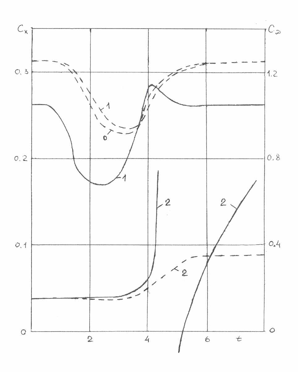 .На правой части Рис. 5 приведены зависимости аэродинамических характеристик от времени как в отсутствие вдува (сплошные кривые), так и при его наличии (штриховые кривые) при =0.25. При принятых параметрах вдува коэффициент сопротивления конуса Сх больше чем в отсутствие вдува, хотя зависимости от времени в обоих случаях качественно совпадают.