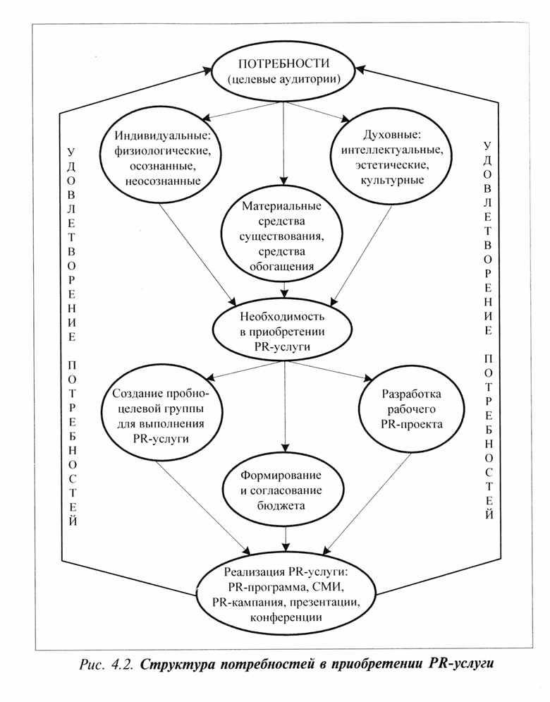 Инфраструктурная сущность PR-услуги. Для получения фундаментальной пользы в обществе PR-услуги удовлетворяют различные материальные, духовные и социальные потребности за счет мотивации и оценки выбора PR-услуги. Структура потребностей в приобретении PR-услуги проиллюстрирована на рис. 4.2.