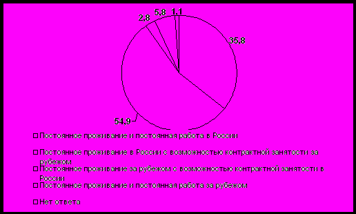 Согласно результатам, абсолютное большинство (91%) выпускников выражают желание и готовность жить в России, но при этом только 36% выпускников определенно связывают свою жизнь и работу с Россией. Более половины (55%) выпускников предпочитают использовать расширяющиеся возможности работы за рубежом на контрактной основе. Эта наиболее предпочтительная стратегия демонстрирует гибкую профессионально-миграционную ориентацию выпускников. Установка на профессиональную миграцию связана с недооценкой интеллектуального труда в российском обществе и пока выступает как потенциальная жизненная стратегия, выражающая собой отрицание России в качестве места приложения приобретенных профессиональных знаний. Однако профессиональная миграция способна завершиться оформлением вида на жительство за рубежом, а в дальнейшем и получением гражданства.