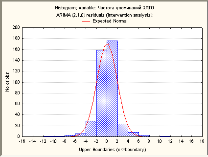 Гистограмма 4. Распределение остатков прогноза методом АРИМА с интервенцией