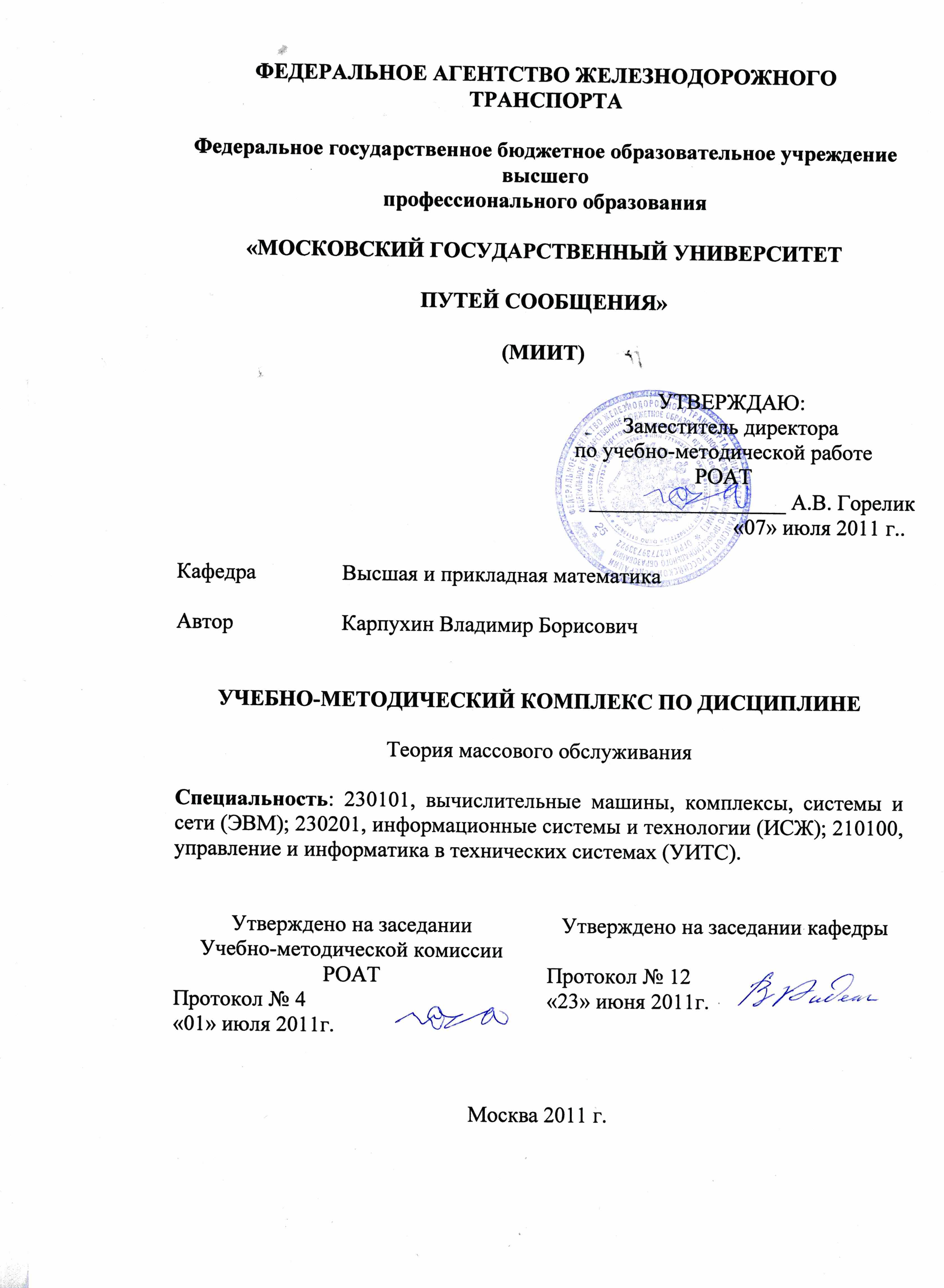 Учебно-методический комплекс по дисциплине «Теория массового обслуживания» составлен в соответствии с требованиями Государственного образовательного стандарта высшего профессионального образования по специальности: 230101, вычислительные машины, комплексы, системы и сети (ЭВМ); 230201, информационные системы и технологии (ИСЖ);210100, управление и информатика в технических системах (УИТС).