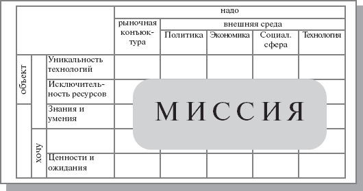 Как было сказано выше, любая компания с ее микро- и макроокружением представляет собой иерархию вложенных друг в друга открытых, субъектно-ориентированных систем. Компания, с одной стороны, является частью рынка, а с другой отстаивает в конкурентной борьбе собственные интересы. Миссия представляет собой результат позиционирования компании среди других участников рынка. Поэтому миссию компании нельзя описывать путем анализа ее внутреннего устройства. Для построения модели взаимодействия компании с внешней средой (определение миссии компании на рынке) необходимо: