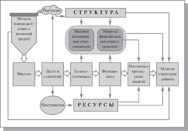 На основании миссии формируются цели и стратегии компании. С их помощью определяется необходимый набор продуктов и, как следствие - требуемые ресурсы. Воспроизводство продукции происходит за счет переработки ресурсов в основном производственном цикле. Его компоненты формируют необходимые бизнес-функции для поставки ресурсов, производства продуктов и их распределения в места реализации. Для управления указанным процессом воспроизводства формируется совокупность компонентов менеджмента, которая порождает набор функций управления. Для поддержания процессов воспроизводства и управления формируются наборы соответствующих функций обеспечения (охраны, технического оснащения, профилактики и ремонта и пр.). Такой подход позволяет описать предприятие с помощью универсального множества управленческих регистров (цели, стратегии, продукты, функции, организационные звенья и пр.). Управленческие регистры представляют собой иерархические классификаторы. Объединяя классификаторы в функциональные группы и закрепляя между собой элементы различных классификаторов с помощью матричных проекций, можно получить модель организационной структуры компании.