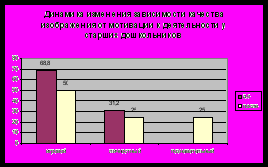 Диаграмма 5 (стр. 17) иллюстрирует положительную динамику в уровне сформированности произвольности (уменьшилось количество детей с низким уровнем – от 81,2% до 37,5% и увеличились процентные показатели среднего уровня - от 18,8% до 62,5%).