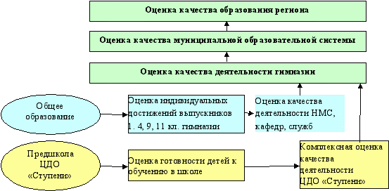Следующим уровнем в этой системе является оценка качества деятельности гимназии, которая базируется не только на оценке индивидуальных достижений обучающегося, а включает в себя еще и оценку условий образовательного процесса.