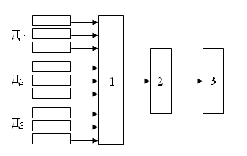 Управление мобильными объектами с помощью любой инерциальной системы может рассматриваться как взаимодействие двух процессов: решения навигационной задачи и решения задачи стабилизации. Рассмотрим эту проблему на примере летательного аппарата, где данные задачи наиболее актуальны в связи с возможностью их автономной работы и высокими скоростями движения. Первая задача заключается в определении требуемой траектории летательного аппарата и в вычислении фактической траектории, вторая — в управлении аппаратом для поддержания требуемого курса с заданной точностью [1]. Так на рис 1. приведена типичная схема бесплатформенной системы управления космическим аппаратом для выхода на геостационарную орбиту. Подобный механизм используется для управления крылатыми ракетами. С бортовой цифровой вычислительной машиной 1 соединены три группы датчиков, условно обозначенных через Д1 , Д2 и Д3.