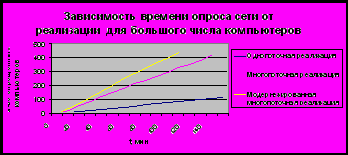 Было проведено моделирования трёх реализаций мониторинга (однопоточный, многопоточный и многопоточный переработанный, разработанный и опубликованный автором в статье «Оптимизация по времени многопоточной модели опроса сети» в сборнике «Научная конференция МИФИ 2005»). По полученным данным были построены нижеприведённые графики (рис. 1).