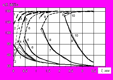 Исходное распределение напряжений (кривая 1, рис.7) меняется еще до усталостного разрушения наиболее нагруженного элемента на краю отверстия. В результате число циклов до появления трещины увеличивается, что позволяет объяснить, отчасти, разницу в численных значениях теоретического и эффективного коэффициентов концентрации напряжений.