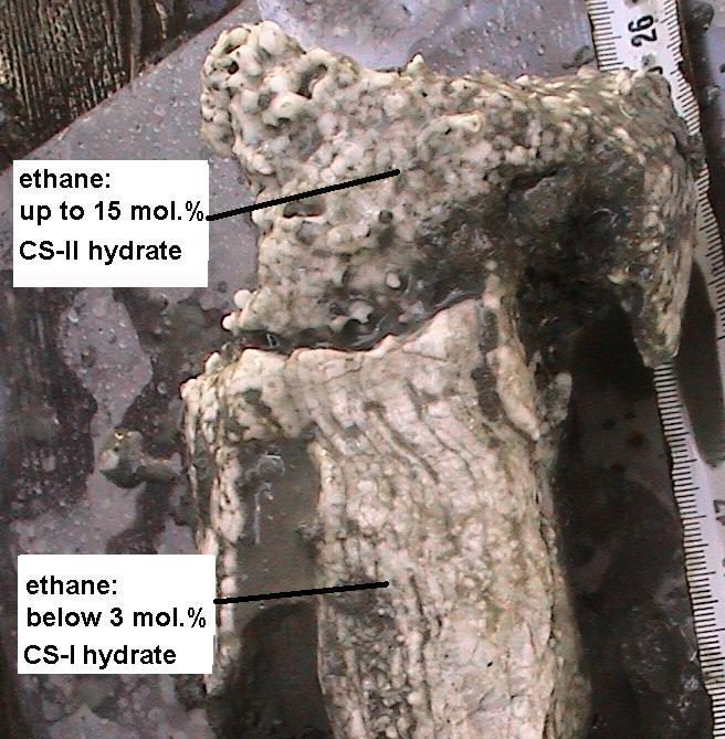 Проанализировав эти эксперименты, нами рассмотрен известный случай природного байкальского гидратного конгломерата, в котором одновременно присутствовали гидраты двух структур КС-I и КС-II. Гидрат был поднят с глубины ~1000 м (на расстоянии около 1 метра от дна озера при температуре воды на дне около плюс 4 оС). В составе нижнего слоя гидрата (структуры КС-I) содержалось ~ 3 мол.% этана, в составе верхнего (структуры КС-II) – около 15 мол.% этана (остальное, – метан). Важно обратить внимание на взаимное положение и морфоло гию обеих гидратных частей (рисунок 2). Нижняя часть монолитна, имеет плотное строение, верхняя часть имеет рыхлое, пористое строение и состоит из множества гранул гидрата.