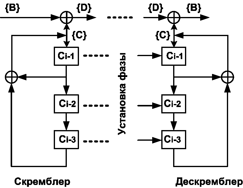 обозначена операция суммирования по модулю 2. Особенностью самосинхронизирующегося скремблера является то, что он управляется самой скремблированной последовательностью, т.е. той, которая поступает в канал. Поэтому в данном случае не требуется специальной установки состояний скремблера и дескремблера, поскольку они оказываются идентичными в результате записи в их регистры сдвига скремблированной последовательности.