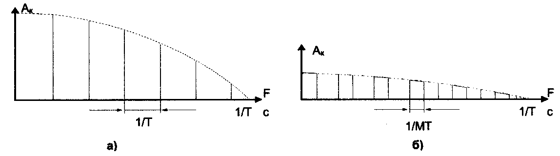 Рассмотрим влияние скремблирования на энергетический спектр двоичного сигнала. На рис. 3.10, а изображен пример энергетического спектра для периодического сигнала с периодом Т, содержащим шесть двоичных элементов с длительностью Т0. После скремблирования ПСП с М = 2u – 1 элементами спектр существенно «обогащается» (рис. 3.10, б). В примере число составляющих спектра увеличилось в М раз, одновременно уровень каждой составляющей уменьшается в такое же число раз.