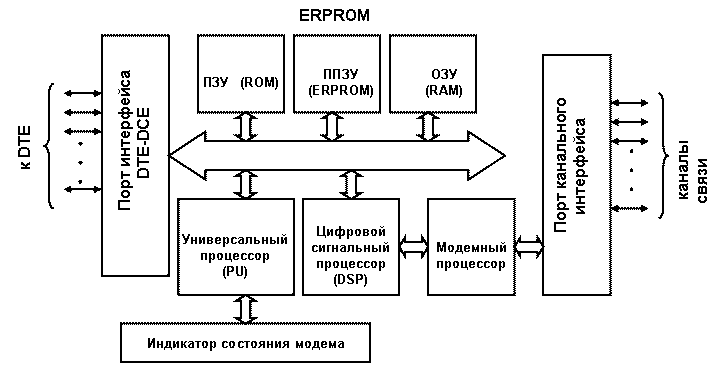 Модем состоит из адаптеров портов канального и DTE-DCE интерфейсов, универсального (PU), цифрового сигнального (DSP) и модемного процессоров, постоянного (ПЗУ, ROM), постоянного энергонезависимого перепрограммируемого (ППЗУ, ERPROM), оперативного (ОЗУ, RAM) запоминающих устройств и схемы индикаторов состояния модема.