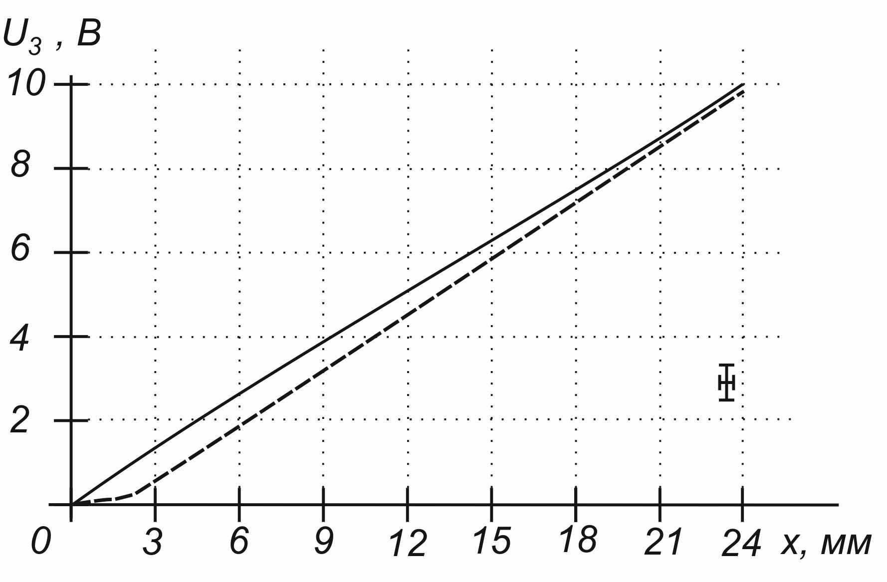 Как следует из Рис. 12, наблюдается линейная зависимость напряжения выходного сигнала U3 от координаты линейного ПЧФ в диапазоне от 3 до 24 мм и угла для дугового ПЧФ в диапазоне от 10 до 80 град.