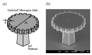 ис. 1. Схематический рисунок и СЭМ микроизображение лазера на микрошестеренке.Тем не менее, лазер столь необычной формы и размеров вполне функиональная вещь. Миниатюрные лазеры нужны во множестве областей, в особенности в системах оптоволоконной связи, где вообще идеальным является размер активной части лазера, равный поперечнику оптического волокна. Однако в этом случае становится существенным то, что отношение объема активного элемента к поверхности падает примерно пропорционально размеру элемента. Поскольку энергия накачки при равенстве прочих факторов пропорциональна объему, а выход света через боковые поверхности представляет собой чистые потери, рано или поздно потери на спонтанное излучение через боковые грани становятся лимитирующим фактором. Если нужен лазер лучше, нужно сделать меньше потери.
