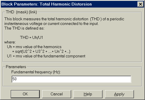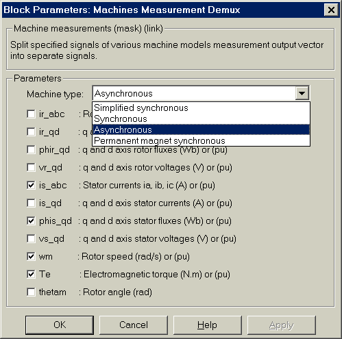 Особый интерес при моделировании электрических цепей представляет блок Powergui основной библиотеки Power System Blockset (рис.1.9). Этот блок, будучи установленным в исследуемую модель электрической цепи, позволяет измерить токи, напряжения и их начальные фазы на любом участке электрической цепи. Для связи блока с электрической схемой служат блоки измерений Multimeter, Voltage Mesurement, Current Mesurement. Кроме того блок Powergui позволяет связать пакет расширения Power System Blockset с пакетом расширения Control System. Это позволяет исследовать частотные характеристики и переходные процессы в электрических цепях. Окно настройки блока показано на рис.1.26. В левом поле отражаются измеряемые величины. Справа кнопки и флажки позволяют выбрать величины для измерения. В выпадающем меню первого поля задаются измеряемые значения (амплитудное или действующее). В выпадающем меню второго поля задается частота. Включенный флажок States позволяет измерить переменные состояния (токи в индуктивностях, напряжения на конденсаторах). Включенный флажок Measurer позволяет измерить все величины, выбранные в окне блока Multimeter и зарегестрированные блоками Voltage Measurement, Current Measurement. Включенный флажок Sources позволяет измерить токи и напряжения источников, а включенный флажок Nonlinear- токи и напряжения в нелинейных элементах.