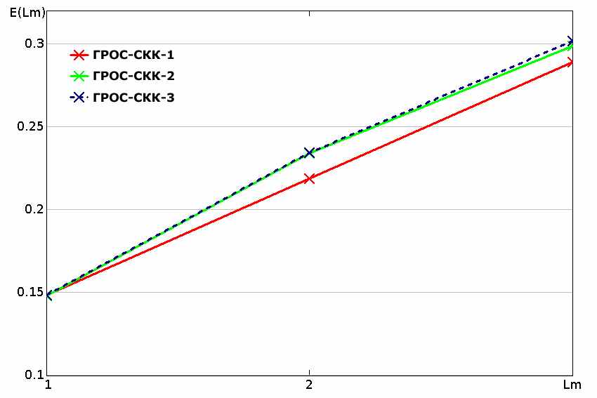 По результатам имитационного моделирования получены зависимости относительной скорости передачи после Lm попыток для трёх стратегий декодирования ГРОС-СКК. Как видно из полученного графика (рис. 9), стратегия ГРОС СКК 3 является наиболее выигрышной, но она является самой сложной по реализации и вычислительным затратам, так как использует больше свёрточных декодеров. Простейшая по реализации стратегия ГРОС-СКК-1 показывает худшие результаты. Стоит заметить, что различие показателей вероятности успешной доставки систем ГРОС-СКК-3 и ГРОС-СКК-2 наблюдается только лишь