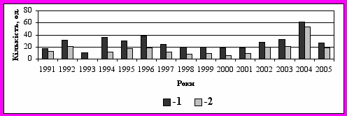 Рис. 1. Динаміка публікацій по роках: всі видання (1); частка матеріалів КНДА (2)