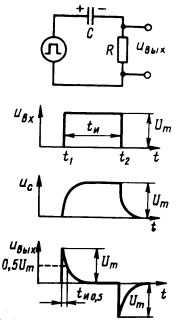 При подаче на вход цепи прямоугольного импульса происходят процессы зарядки и разрядки конденсатора (катушки индуктивности). Данные процессы определяются постоянной времени цепи, обозначаемой τ (тау). Постоянная времени RC или RL-цепи равна τ =RC или τ =RL.