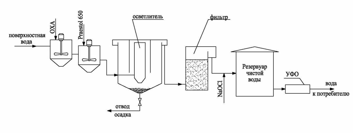 Схема 1. Реагентная обработка – смешение – осветление – напорная фильтрация – обеззараживание воды (см. рис.14).