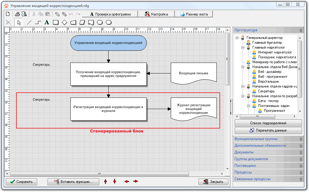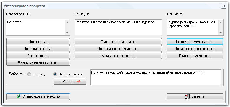 С помощью автогенератора Вы можете вставить в процесс сразу название функции, ответственных за её выполнение и поставить необходимые ссылки на документы: