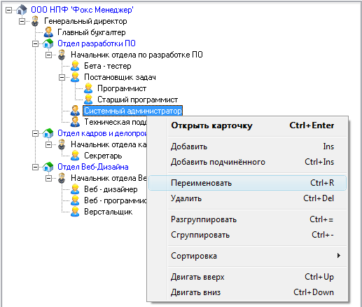 ля того чтобы переименовать существующую должность, например «Системный администратор» необходимо выделить эту должность, левой клавишей мышки вызвать меню управления деревом организационной структуры нажав правую кнопку мышки и кликнуть на пункт меню «Переименовать».