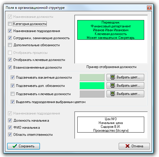 Вы можете самостоятельно настроить удобное для вас отображение полей в организационной структуре. Также с помощью данного окна вы можете настроить подсветку ключевых, дополнительных и вакантных должностей.