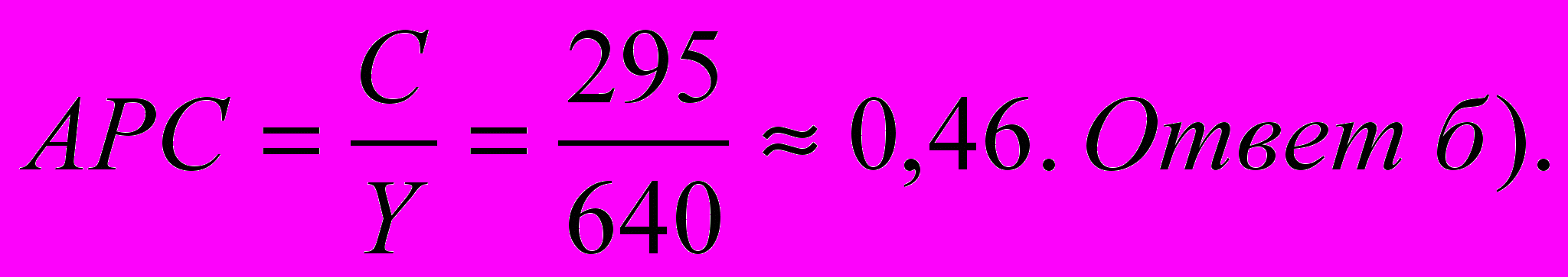 5. Реальный национальный доход увеличился с 580 до 640 млрд. ден. ед., при этом потребительские расходы выросли с 245 до 295 млрд. ден. ед. Средняя склонность к потреблению равна …: а) 0,15; б) 0,46; в) 0,42; г) 0,85.