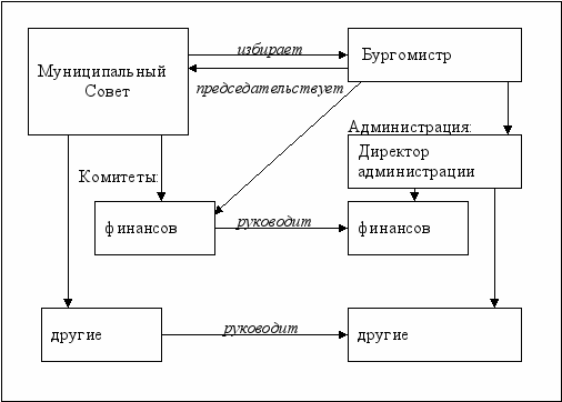 Структурой местного управления низшего уровня территориальной организации является коммуна. На этой ступени существуют лишь органы самоуправления, состоящие из членов представительного уровня - совета коммуны и бургомистра, руководящего работой совета и муниципальной администрации.