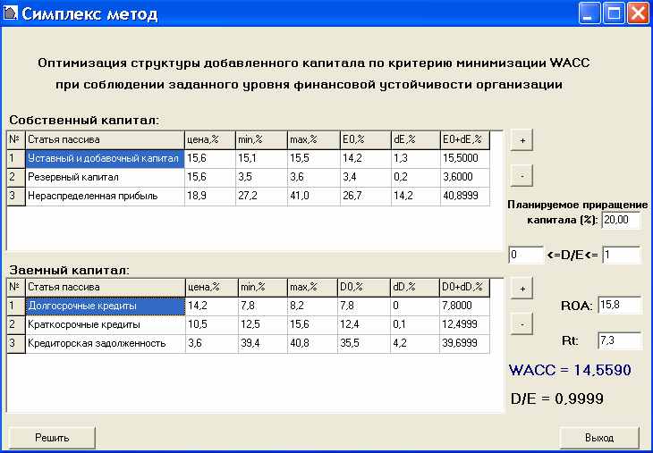 Основным отличием данной ситуации от предыдущей является то, что для расчета WACC финансовым менеджерам компании необходимо знать прогнозные значения цены привлекаемых финансовых ресурсов. Кроме того, в программе установлены минимальные и максимальные ограничения на планируемое распределение добавленного капитала, исходя из прогнозируемого общего приращения валюты баланса.
