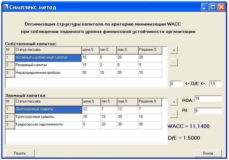 Финансовый менеджер задает значения цены различных источников финансирования, плеча финансового рычага и ряда других показателей. В результате получает минимальное значение средневзвешенной цены капитала при заданных ограничениях финансовой устойчивости.
