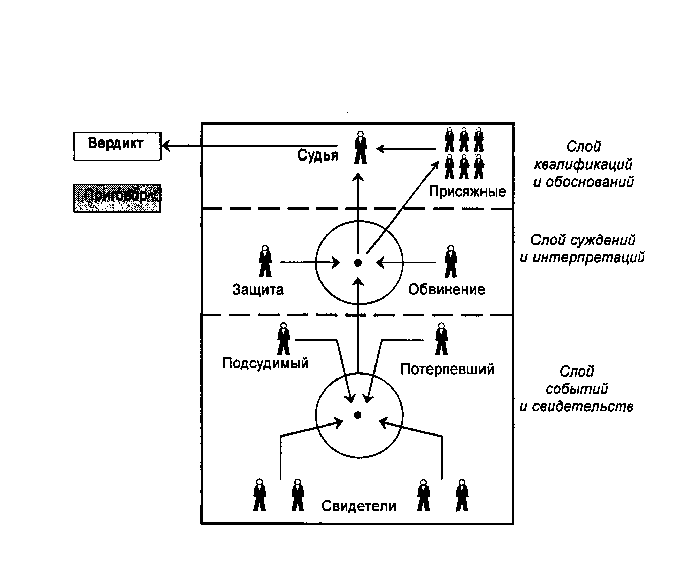 Применительно к одному из важнейших правовых институтов – суду – представления об институциональном опосредовании можно развернуть в схему структуры пространства института состязательного правосудия (слой событий и свидетельств; слой суждений и интерпретаций; слой квалификаций и обоснований – схема 2) [21, с. 18-19; 23, с. 449-451; 20, с. 301].