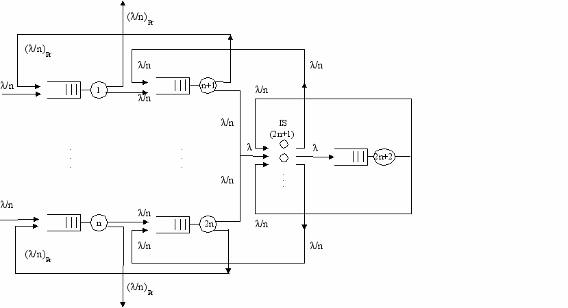 .Узел (2n+1) представляет собой СМО M/G/ с обслуживанием без ожидания, на которую поступает суммарный поток заявок с узлов j (j=n+1,…,2n) и узла (2n+2).