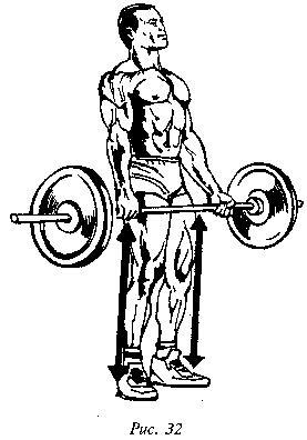 - В исходном положении гриф возле бедер, колени чуть согнуты, спина прямая.