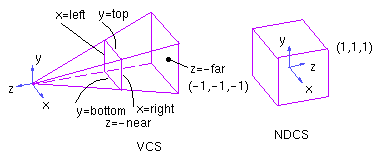 Основной задачей проектирования является перевод 3-х мерного объекта, заданного в видовой системе координат (VCS), в 2-х мерный объект нормализованной системы координат устройства (NDCS).