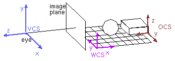 Задание 3D объекта и его создание разбивается на несколько этапов, в процессе которых последовательно преобразуется система координат. Изначально объект задается в некоторой своей локальной системе координат (OCS-object coordinate system), которая затем размещается в мировой системе координат (WCS - world coordinate system). Далее определяем видовую систему координат (VCS – viewing coordinate system), задавая картинную плоскость, положение глаза (камеры) и систему координат камеры.