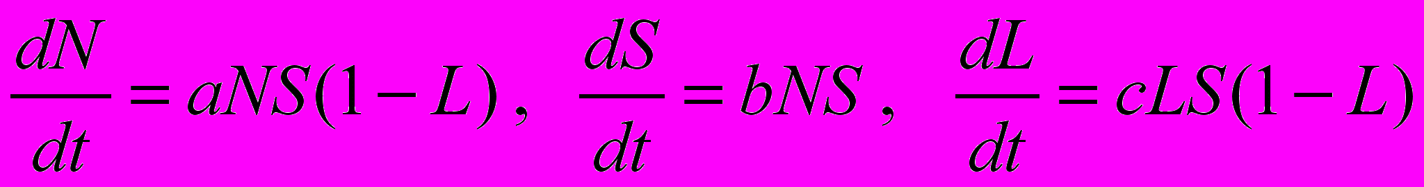 где a, b, с – константы, N – население, S – «излишек» разница между производимым продуктом и минимально необходимым для выживания m (значение S близко по смыслу уровню технологии), L – уровень грамотности населения (изменяется от 0 до 1). Мировой ВВП рассчитывается как G = N (S + m).