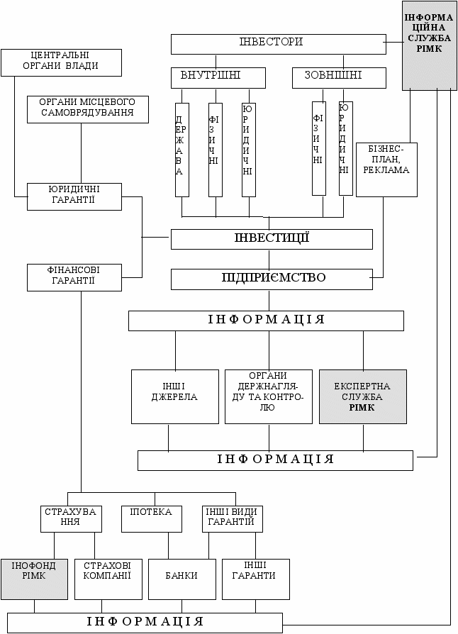 | 5 | Виконавчий | Органи державного контролю та нагляду | Підрозділи служб РІМК ( екологічної, економічної, фінансової експертиз; патентно-ліцензійний; консалтингу; виставочно-демонстраційні комплекси; маркетингу; регіональні сервери; органи ДІФУ; БІС тощо. | Надання послуг фірмам, контроль ходу виконання їх проектів, виконання рішень вищих порядків |
