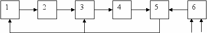 Схема имеет следующие позиции: 1- источник излучения (управляемый источник рентгеновского излучения на базе ускорительной трубки, изотопный гамма источник или ультразвуковой излучатель); 2- исследуемый объект; 3- первичный преобразователь информации (гамма детектор или микрофон); 4- преобразователь "аналог-код"; 5- профессиональный компьютер; 6- буфер для передачи контрольной информации. Компьютер имеет функции управления излучателем и системой регистрации, а так же обработки полученного сигнала. Через буфер в компьютер подается эталонный сигнал.