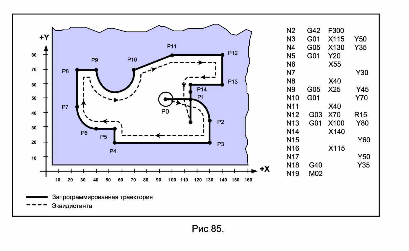 5. Примеры. Некоторые дополнительные примеры показаны: на рис. 84 (инструкция G41 для внешнего контура); на рис. 85 (инструкция G42 для внутреннего контура).