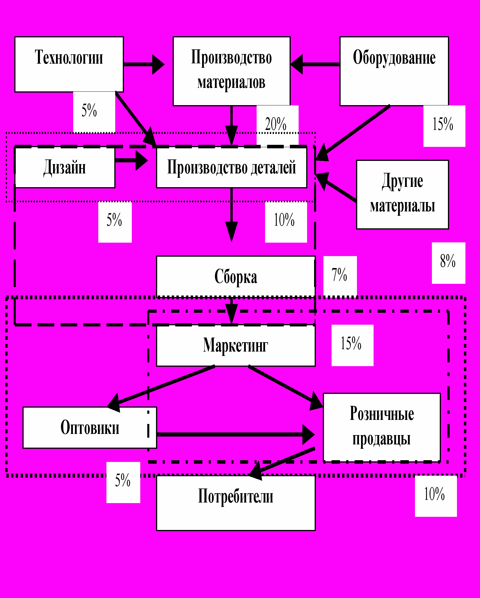 Рис.1-м. Цепочка создания добавленной стоимости (на примере корпусной мебели). Примечание: Цепочка добавленной стоимости включает звенья, выделенные по функциональному признаку. Вместе с тем, на рисунке приведены типичные (хотя далеко не все) варианты организационного объединения отдельных стадий цепочки