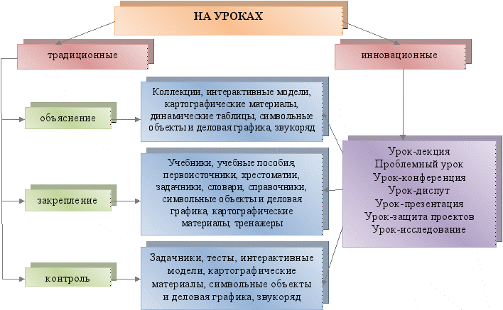 Предлагаем общие рекомендации по использованию разных видов ЦОР на конкретных этапах урока и во внеурочной деятельности (см. схемы).